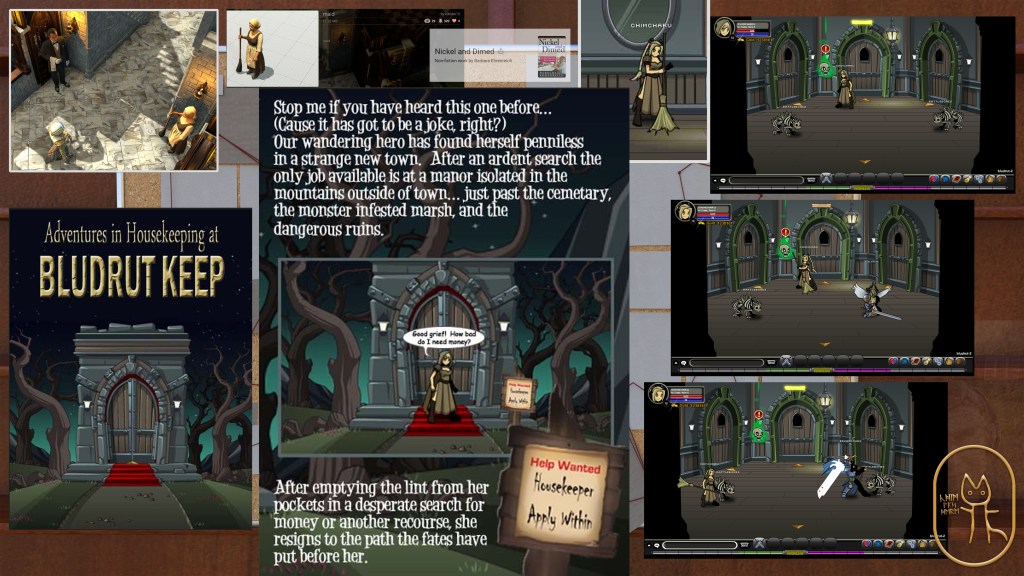 About the Art: I am making a special holiday map for one of the other Alchemist (mini challenge) and setting up this Butler and Housekeeper (by elbobo19) which reminded me of Adventure Quest (one of my first mmos) There were quest-giving NPC’s upstairs Butler and Housekeeper at Bludrut Keep, which made the costume available (for Founders.)