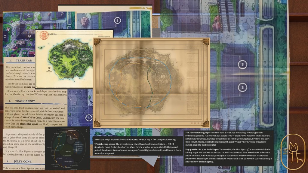 About the Art; my Notes on the “Railway” map challenge. My cub wants to try to run games online. Her friends want to play in Obojima, so she gets excited. I can make it to the Train Station in Sunken Town! She sends some pix from the book.